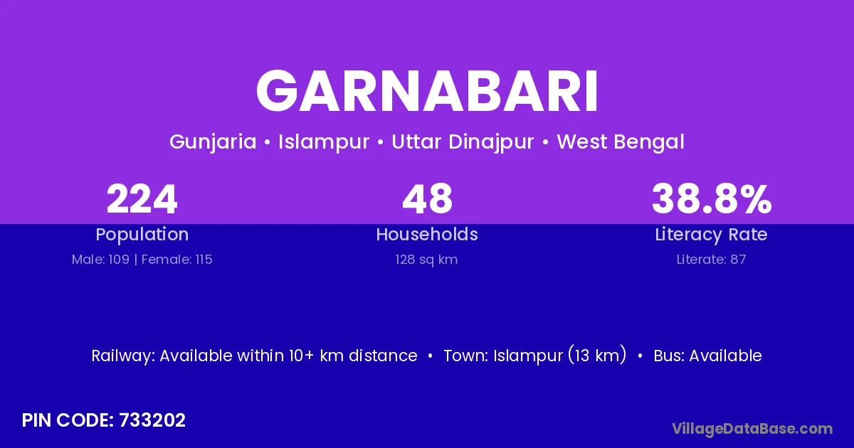 Islampur (13 km) is the nearest town to Garnabari village for major economic activities and is located approximately 13 km away.