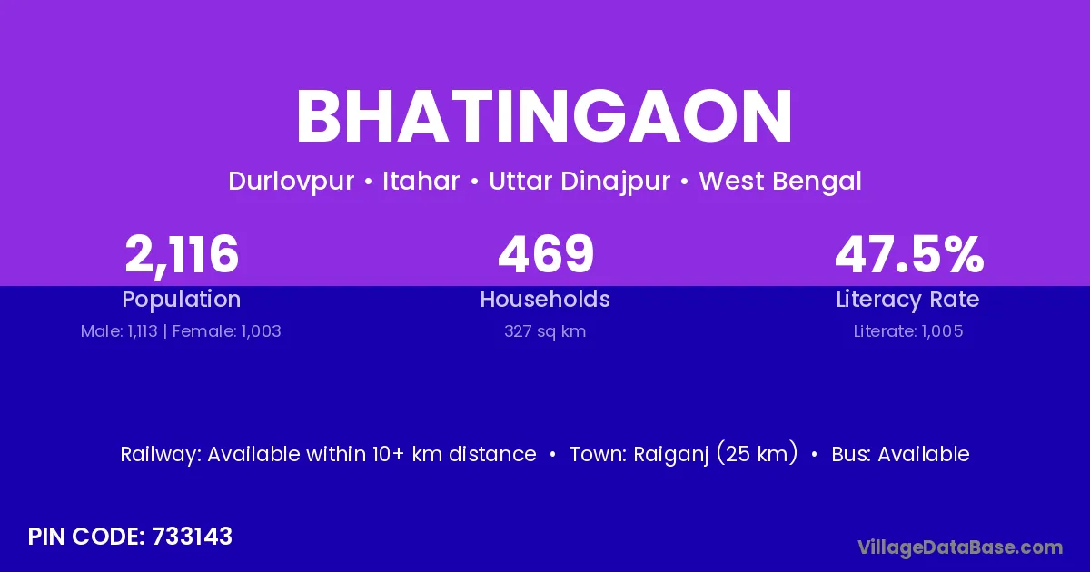 Raiganj (25 km) is the nearest town to Bhatingaon village for major economic activities and is located approximately 25 km away.