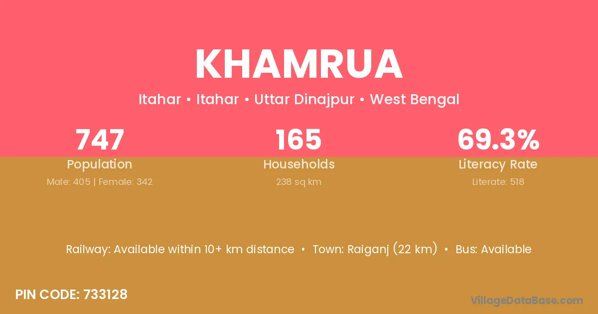 Raiganj (22 km) is the nearest town to Khamrua village for major economic activities and is located approximately 22 km away.