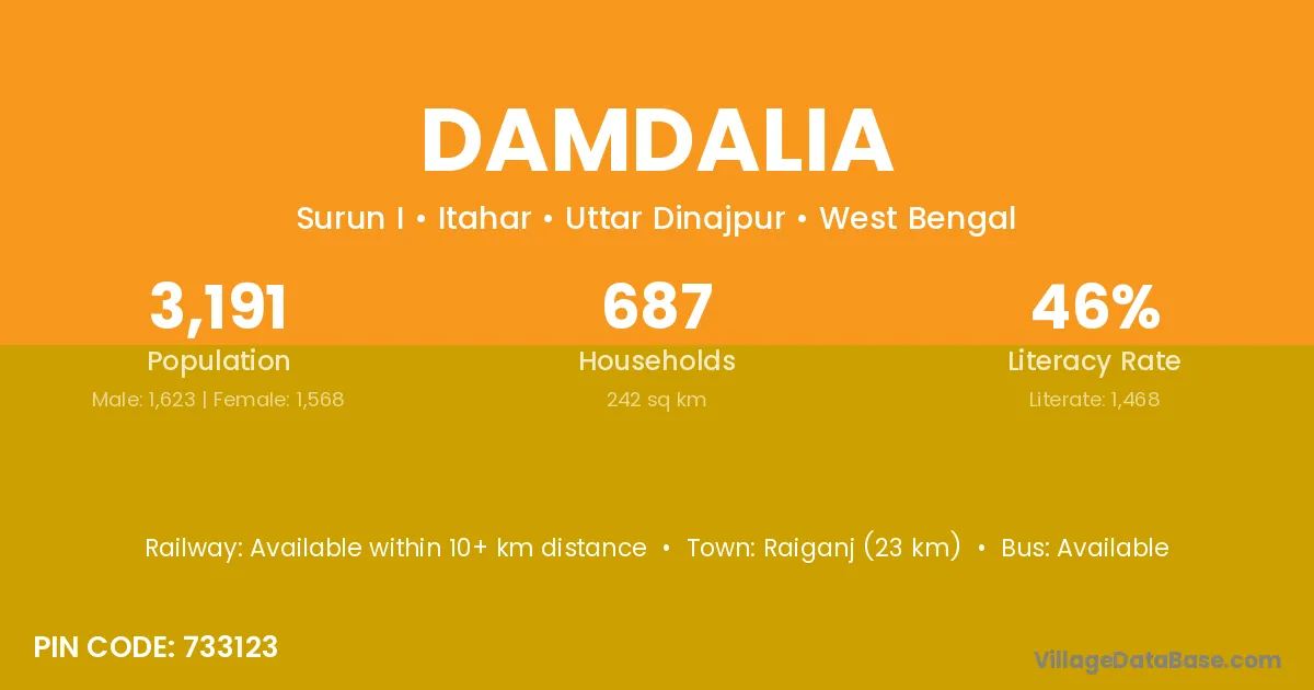 Raiganj (23 km) is the nearest town to Damdalia village for major economic activities and is located approximately 23 km away.
