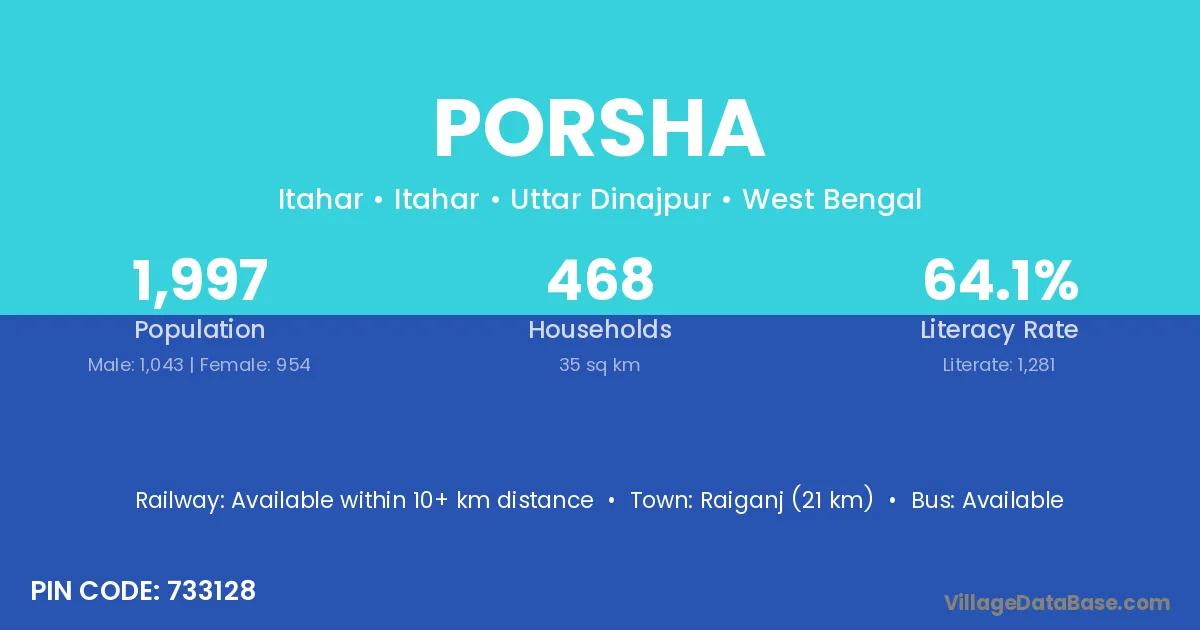 Raiganj (21 km) is the nearest town to Porsha village for major economic activities and is located approximately 21 km away.