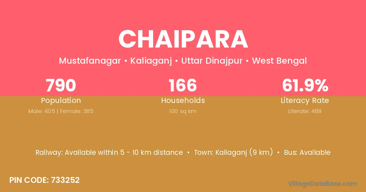 Kaliaganj (9 km) is the nearest town to Chaipara village for major economic activities and is located approximately 9 km away.