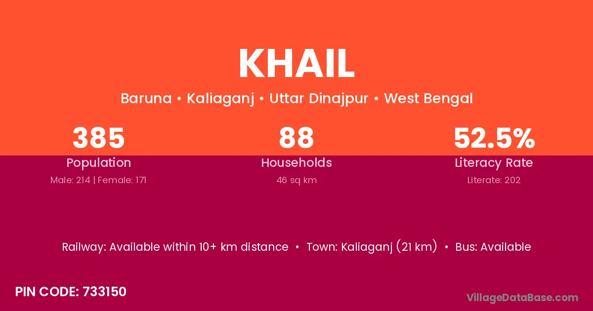Kaliaganj (21 km) is the nearest town to Khail village for major economic activities and is located approximately 21 km away.