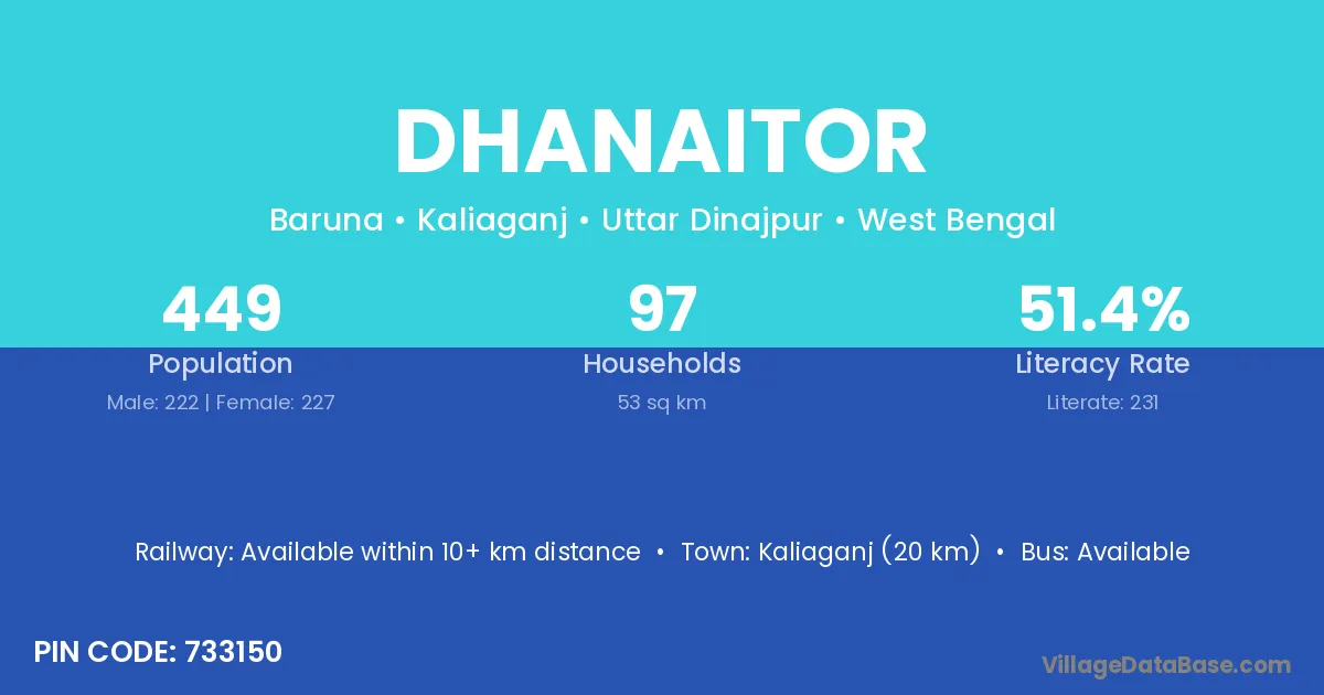 Kaliaganj (20 km) is the nearest town to Dhanaitor village for major economic activities and is located approximately 20 km away.