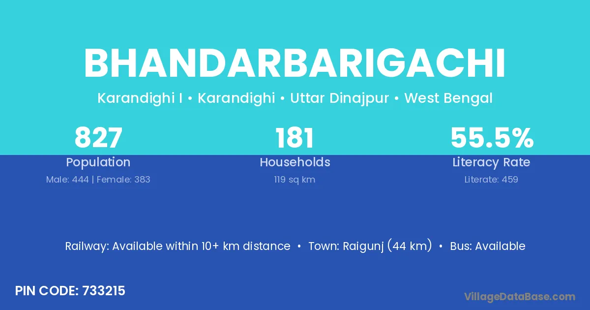 Raigunj (44 km) is the nearest town to Bhandarbarigachi village for major economic activities and is located approximately 44 km away.
