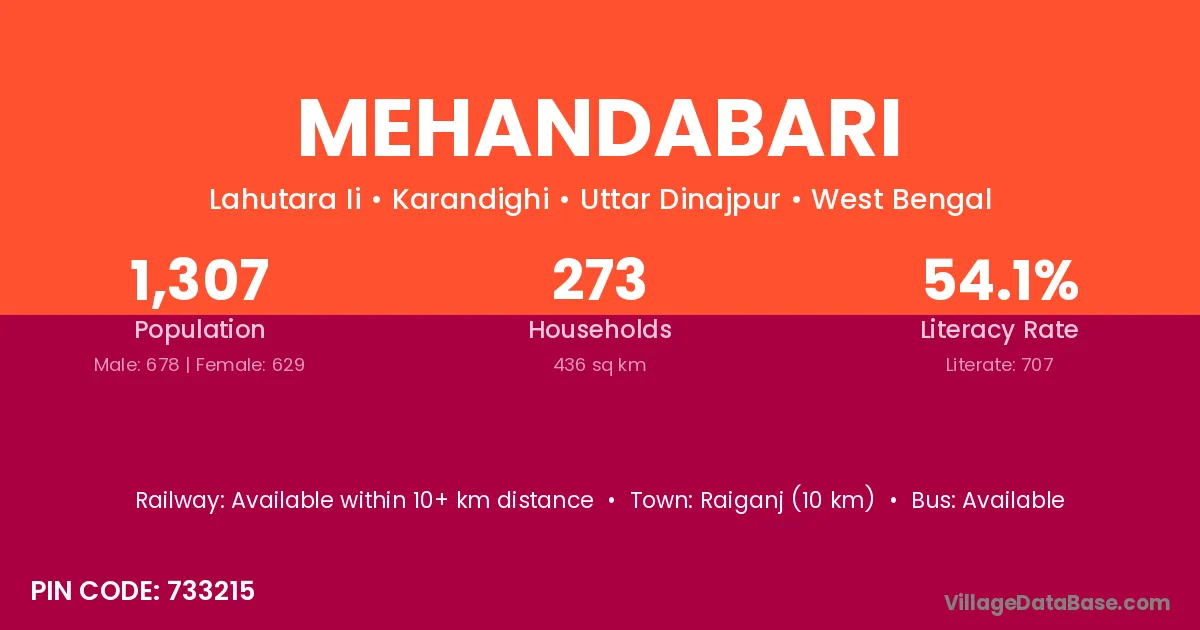 Mehandabari village has a total population of 1,307 people, of which 678 are males and 629 are females.