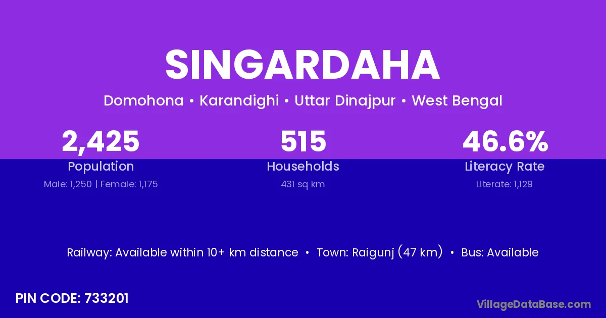 Raigunj (47 km) is the nearest town to Singardaha village for major economic activities and is located approximately 47 km away.