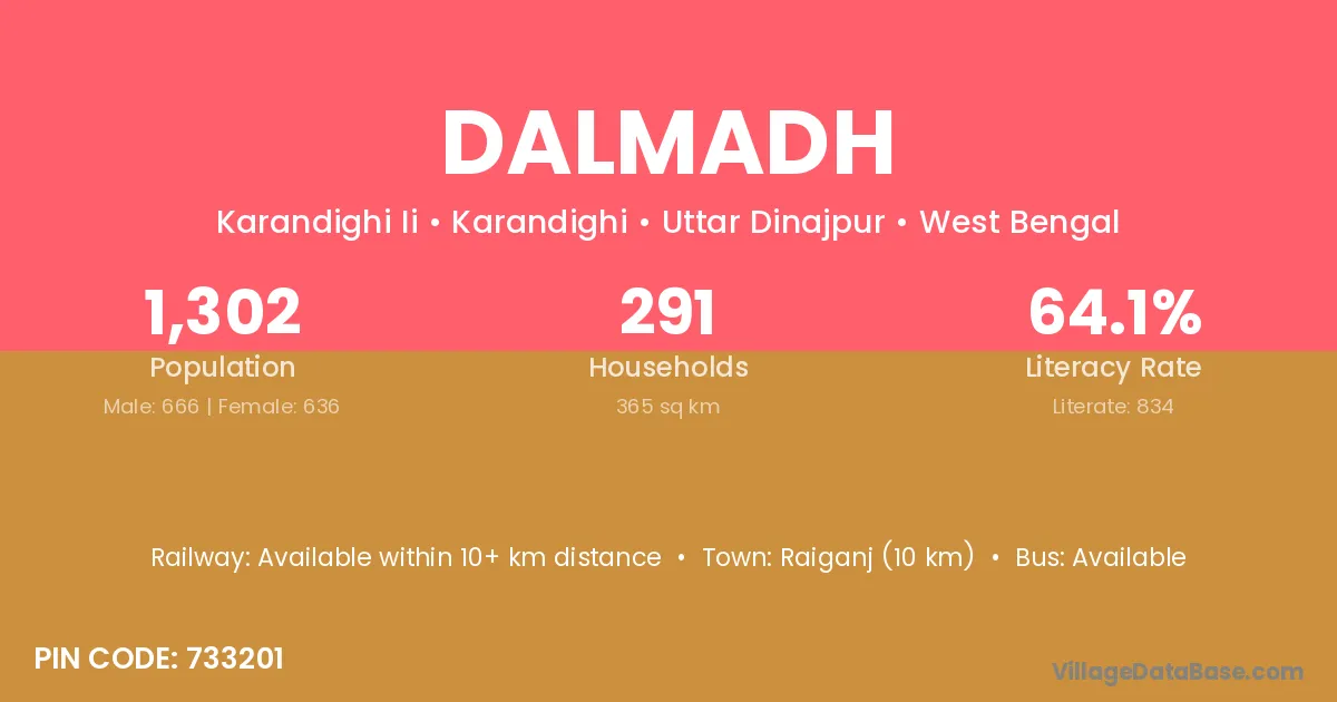 Raiganj (10 km) is the nearest town to Dalmadh village for major economic activities and is located approximately 10 km away.