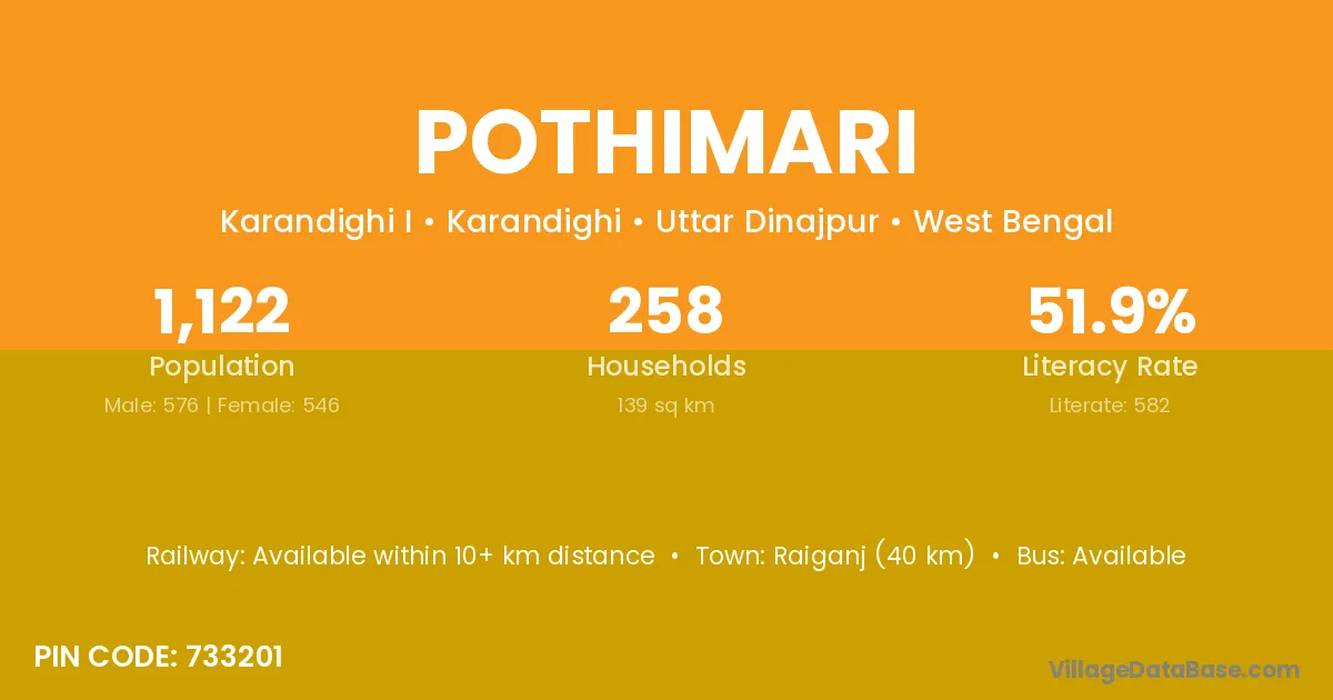 Raiganj (40 km) is the nearest town to Pothimari village for major economic activities and is located approximately 40 km away.
