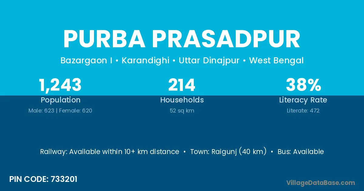 Raigunj (40 km) is the nearest town to Purba Prasadpur village for major economic activities and is located approximately 40 km away.