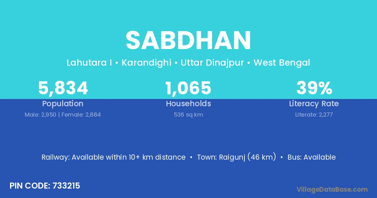 Raigunj (46 km) is the nearest town to Sabdhan village for major economic activities and is located approximately 46 km away.