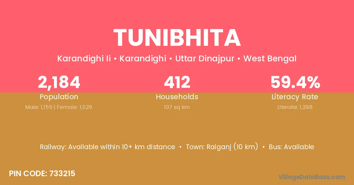 Raiganj (10 km) is the nearest town to Tunibhita village for major economic activities and is located approximately 10 km away.