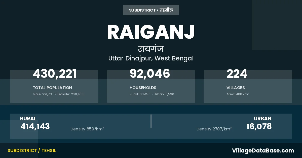 According to the 2011 census The total area of Raiganj Subdivision is 488 km², with a population of 430221 people. The population density is 881 inhabitants per square kilometre, and there are approximately 92046 houses in the sub district.