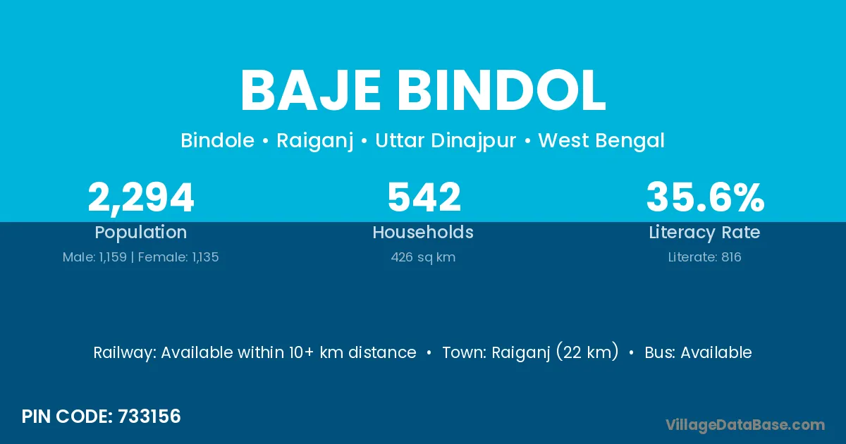 Raiganj (22 km) is the nearest town to Baje Bindol village for major economic activities and is located approximately 22 km away.