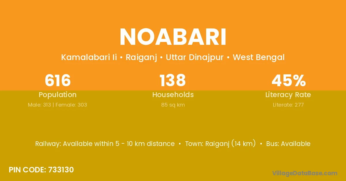 Raiganj (14 km) is the nearest town to Noabari village for major economic activities and is located approximately 14 km away.
