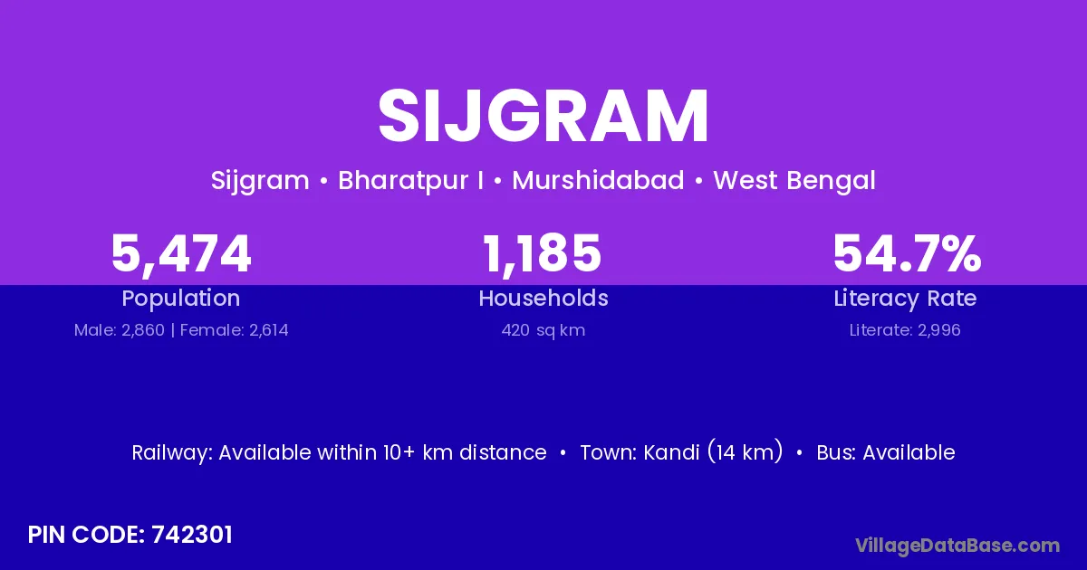 Raigang (4 km) is the nearest town to Sijgram village for major economic activities and is located approximately 4 km away.