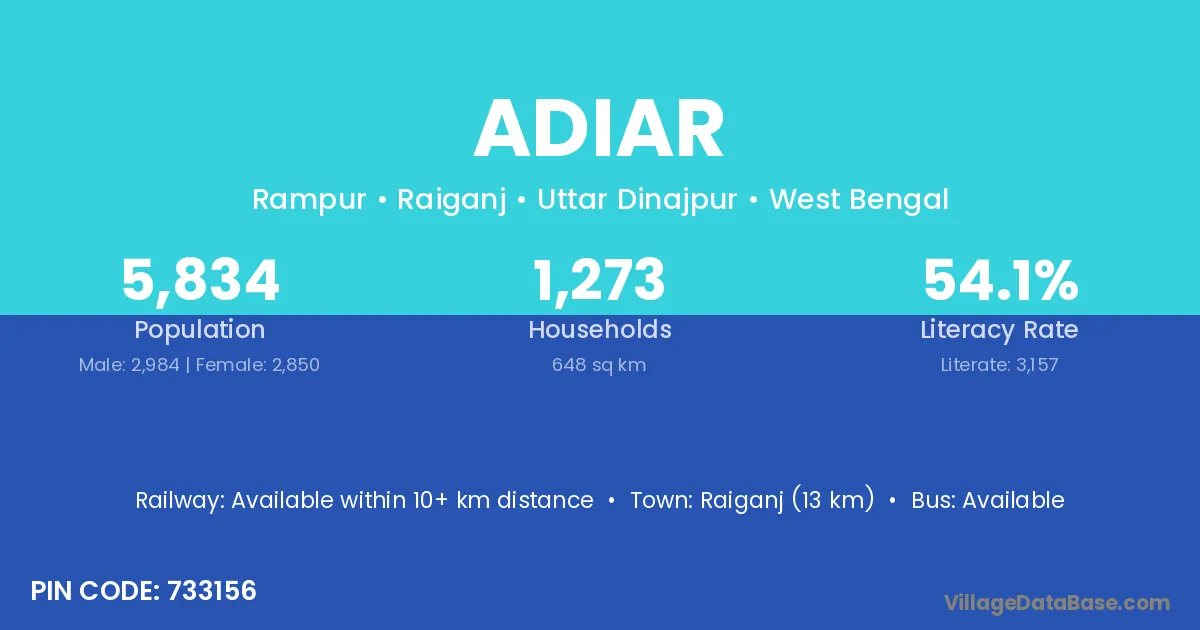 Raiganj (13 km) is the nearest town to Adiar village for major economic activities and is located approximately 13 km away.