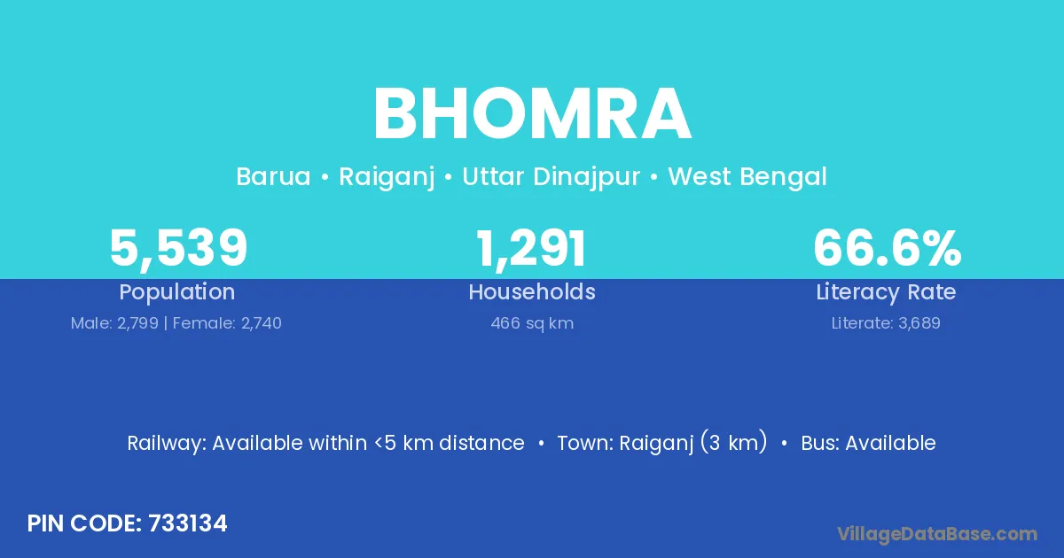Raiganj (3 km) is the nearest town to Bhomra village for major economic activities and is located approximately 3 km away.