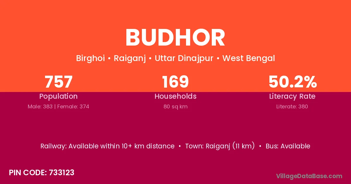 Raiganj (11 km) is the nearest town to Budhor village for major economic activities and is located approximately 11 km away.