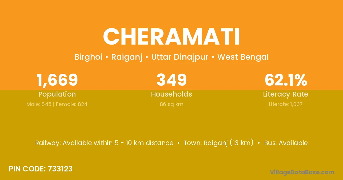 Raiganj (13 km) is the nearest town to Cheramati village for major economic activities and is located approximately 13 km away.
