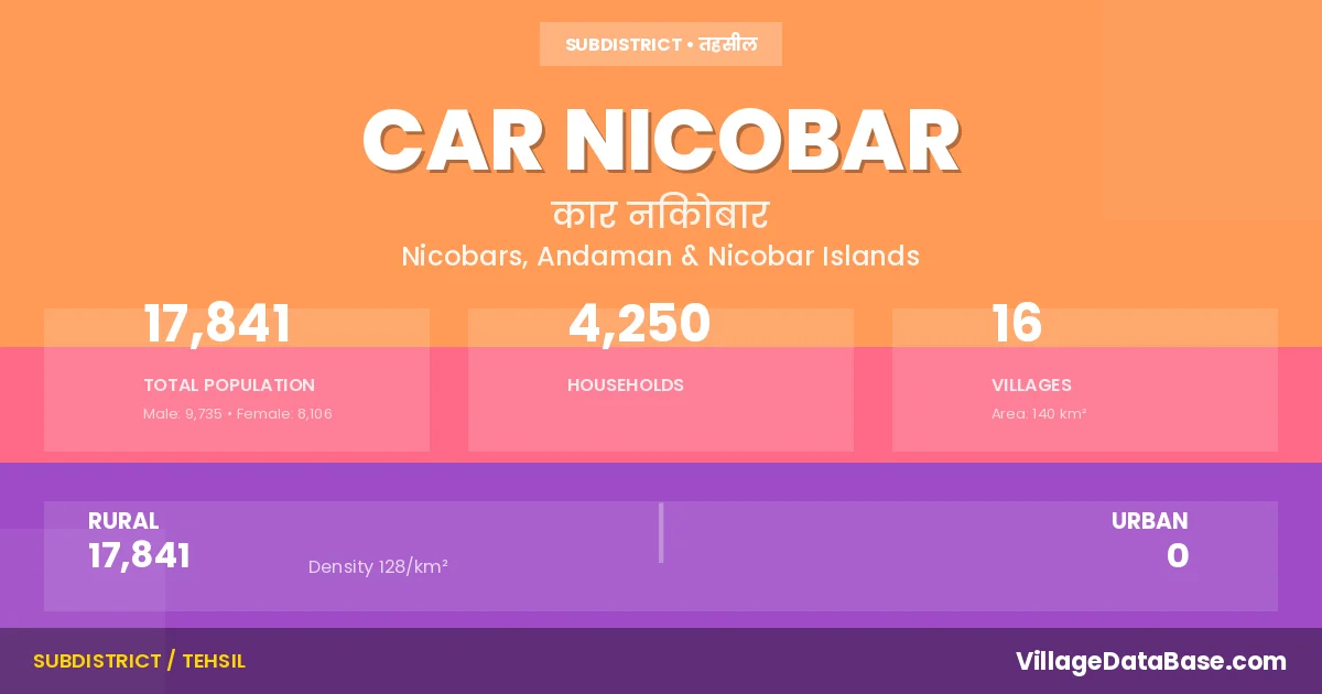 According to the 2011 census The total area of Car Nicobar Tehsil is 140 km², with a population of 17841 people. The population density is 128 inhabitants per square kilometre, and there are approximately 4250 houses in the sub district.