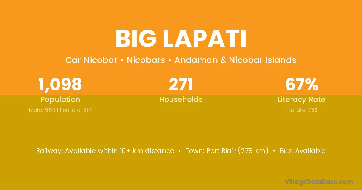 Port Blair (278 km) is the nearest town to Big Lapati village for major economic activities and is located approximately 278 km away.