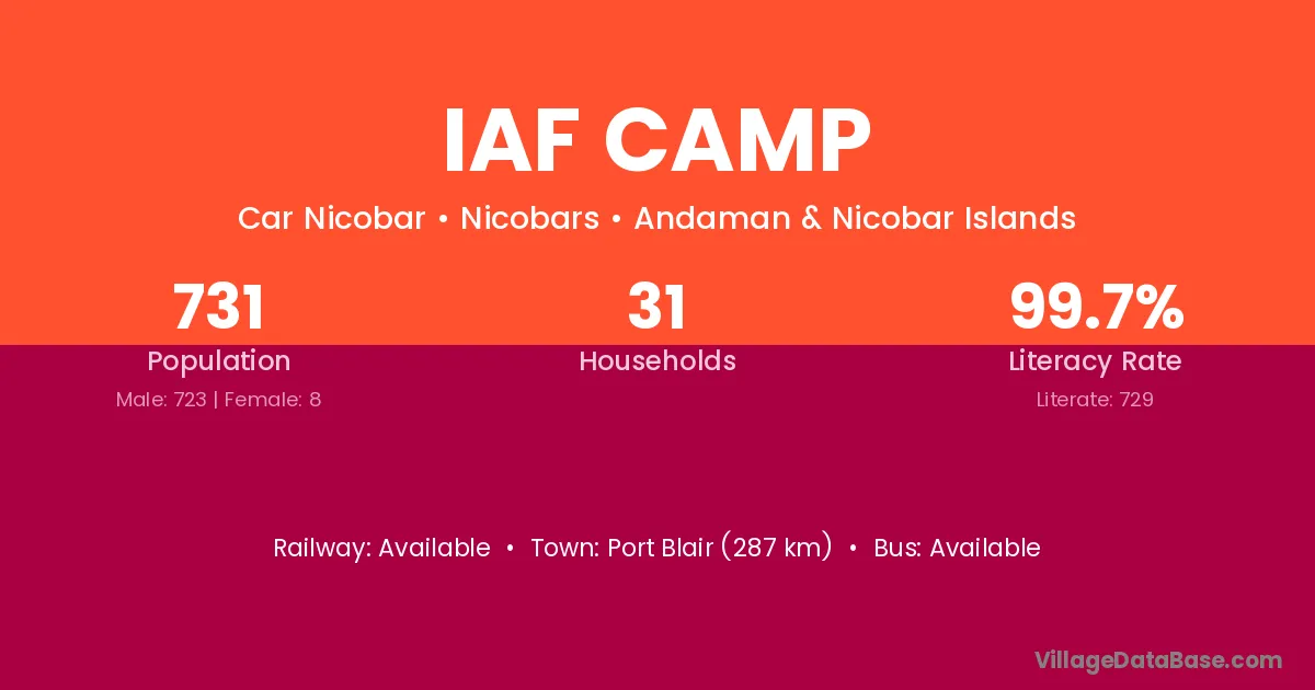 Port Blair (287 km) is the nearest town to Iaf Camp village for major economic activities and is located approximately 287 km away.