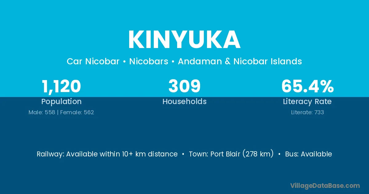 Port Blair (278 km) is the nearest town to Kinyuka village for major economic activities and is located approximately 278 km away.