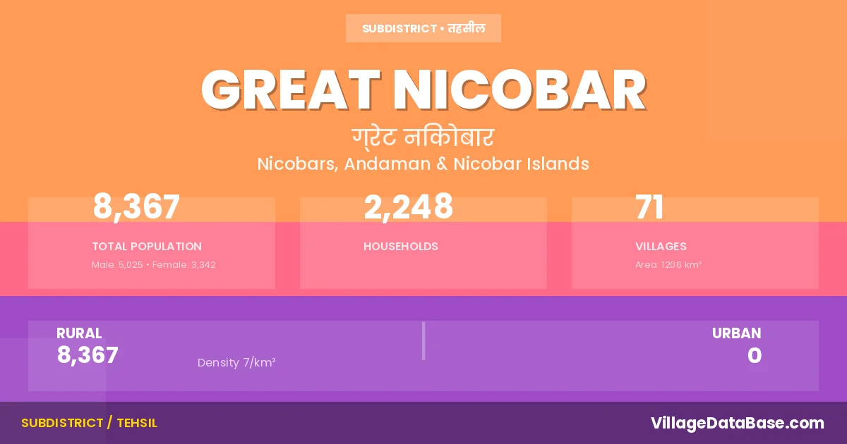 According to the 2011 census The total area of Great Nicobar Tehsil is 1206 km², with a population of 8367 people. The population density is 7 inhabitants per square kilometre, and there are approximately 2248 houses in the sub district.