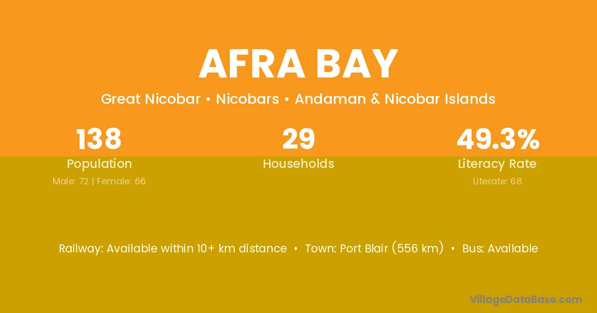 Port Blair (556 km) is the nearest town to Afra Bay village for major economic activities and is located approximately 556 km away.