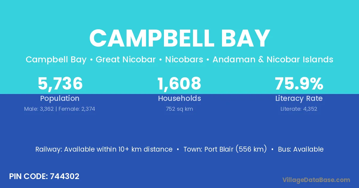 Campbell Bay village has a total population of 5,736 people, of which 3,362 are males and 2,374 are females.