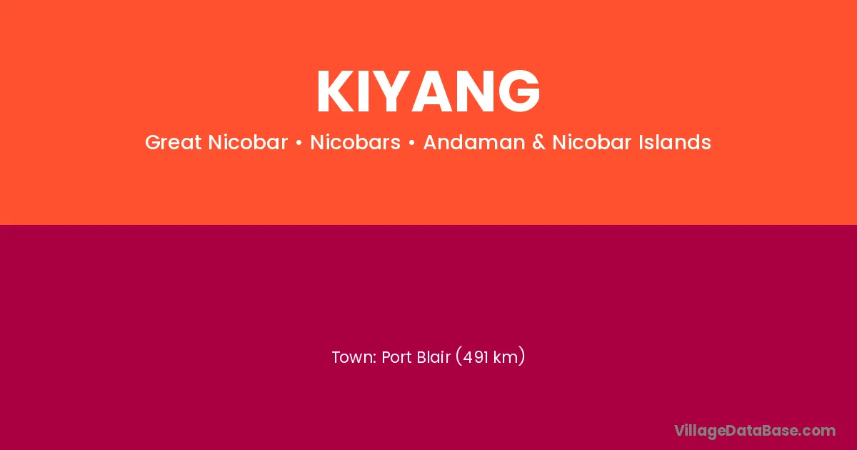 Port Blair (491 km) is the nearest town to Kiyang village for major economic activities and is located approximately 491 km away.