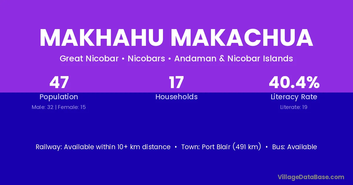 Port Blair (491 km) is the nearest town to Makhahu Makachua village for major economic activities and is located approximately 491 km away.