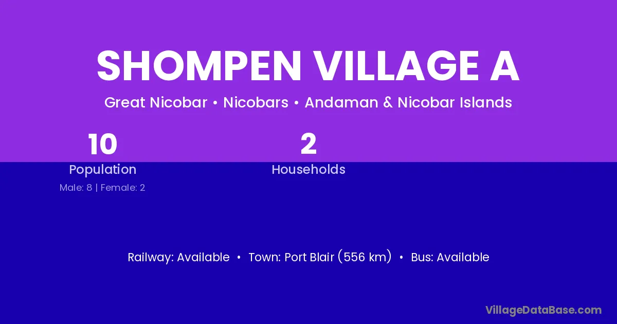 Port Blair (556 km) is the nearest town to Shompen Village A village for major economic activities and is located approximately 556 km away.