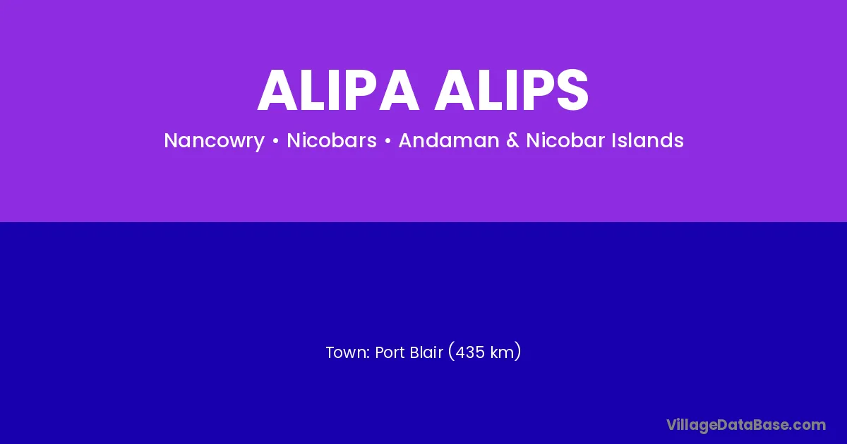 Port Blair (435 km) is the nearest town to Alipa Alips village for major economic activities and is located approximately 435 km away.