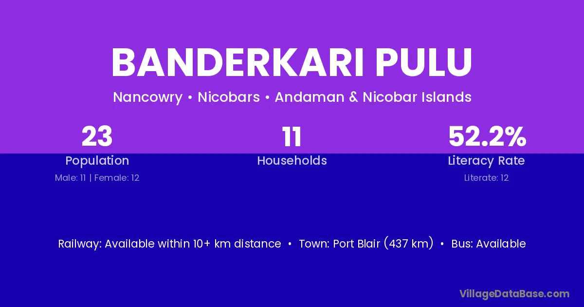 Port Blair (437 km) is the nearest town to Banderkari Pulu village for major economic activities and is located approximately 437 km away.