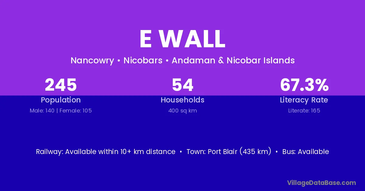 Port Blair (435 km) is the nearest town to E Wall village for major economic activities and is located approximately 435 km away.