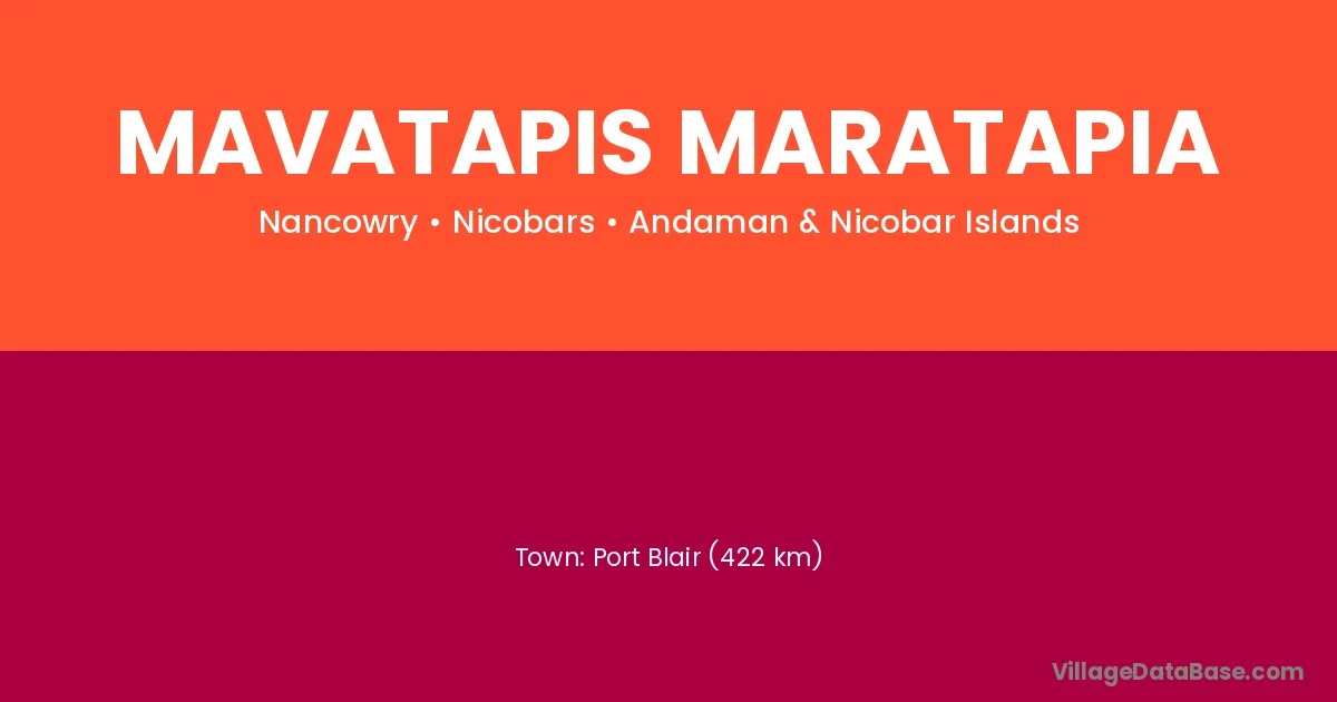 Port Blair (422 km) is the nearest town to Mavatapis Maratapia village for major economic activities and is located approximately 422 km away.