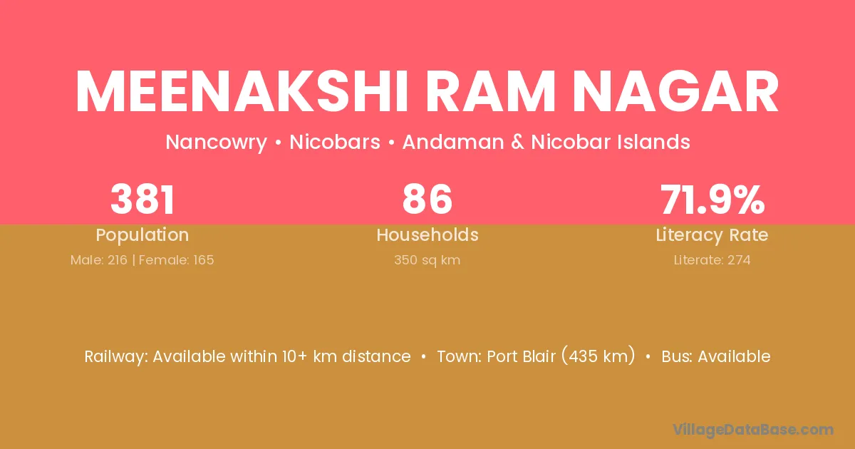 Port Blair (435 km) is the nearest town to Meenakshi Ram Nagar village for major economic activities and is located approximately 435 km away.