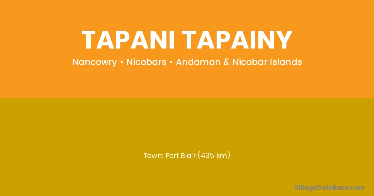 Port Blair (435 km) is the nearest town to Tapani Tapainy village for major economic activities and is located approximately 435 km away.
