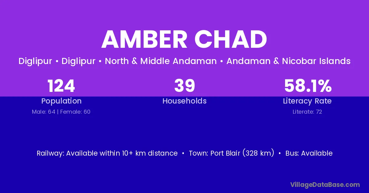 Port Blair (328 km) is the nearest town to Amber Chad village for major economic activities and is located approximately 328 km away.