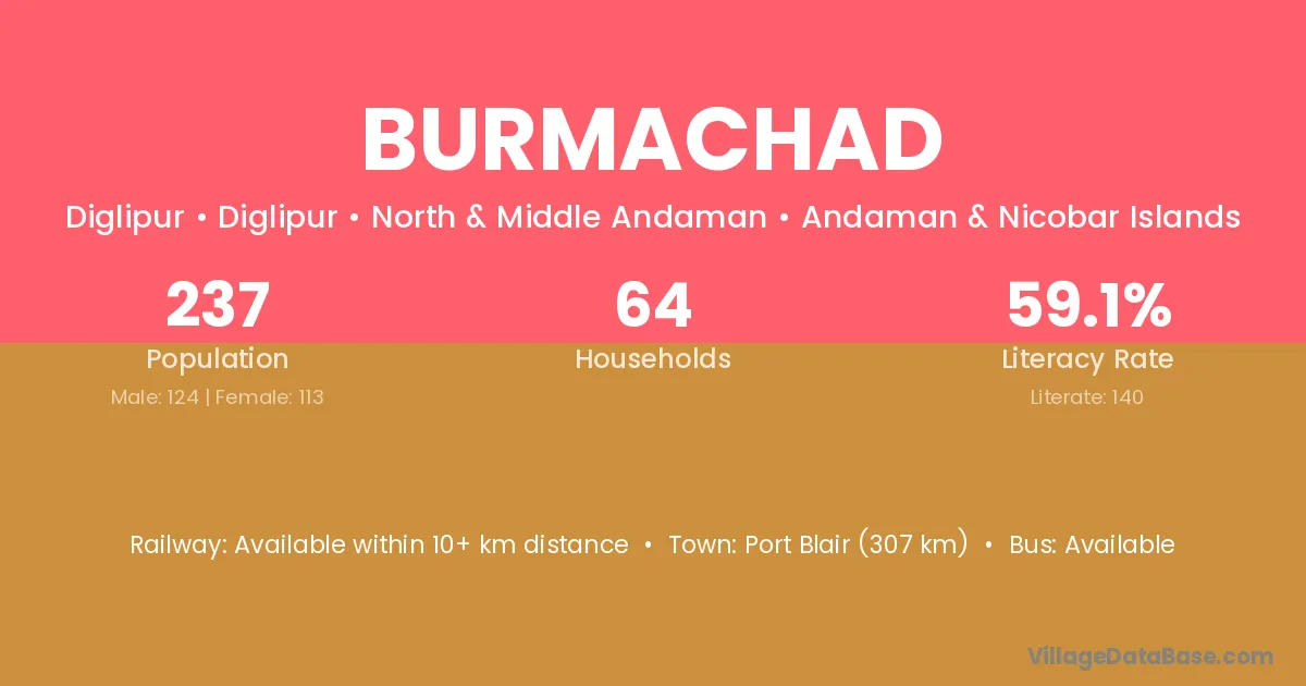 Port Blair (307 km) is the nearest town to Burmachad village for major economic activities and is located approximately 307 km away.
