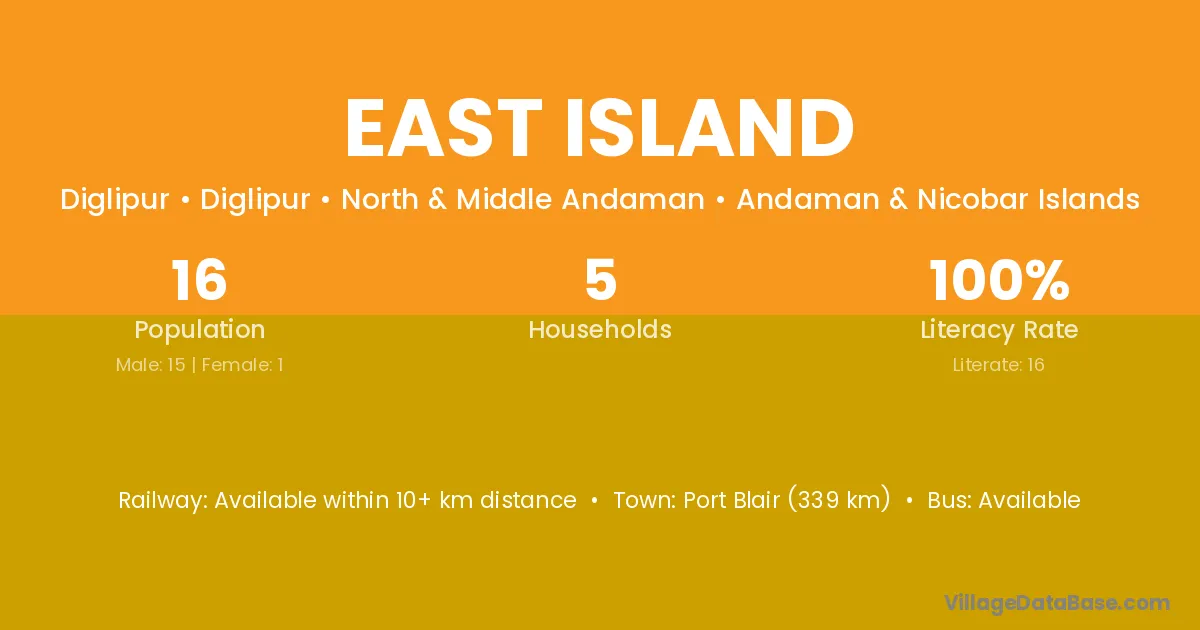 Port Blair (339 km) is the nearest town to East Island village for major economic activities and is located approximately 339 km away.