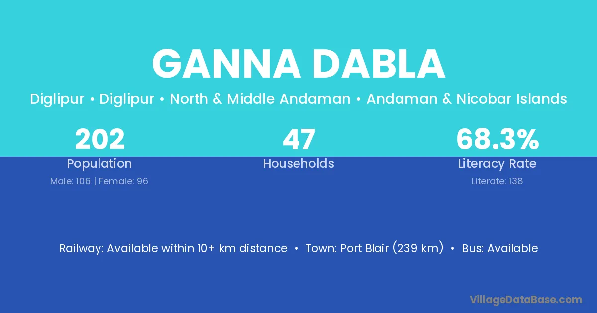Port Blair (239 km) is the nearest town to Ganna Dabla village for major economic activities and is located approximately 239 km away.