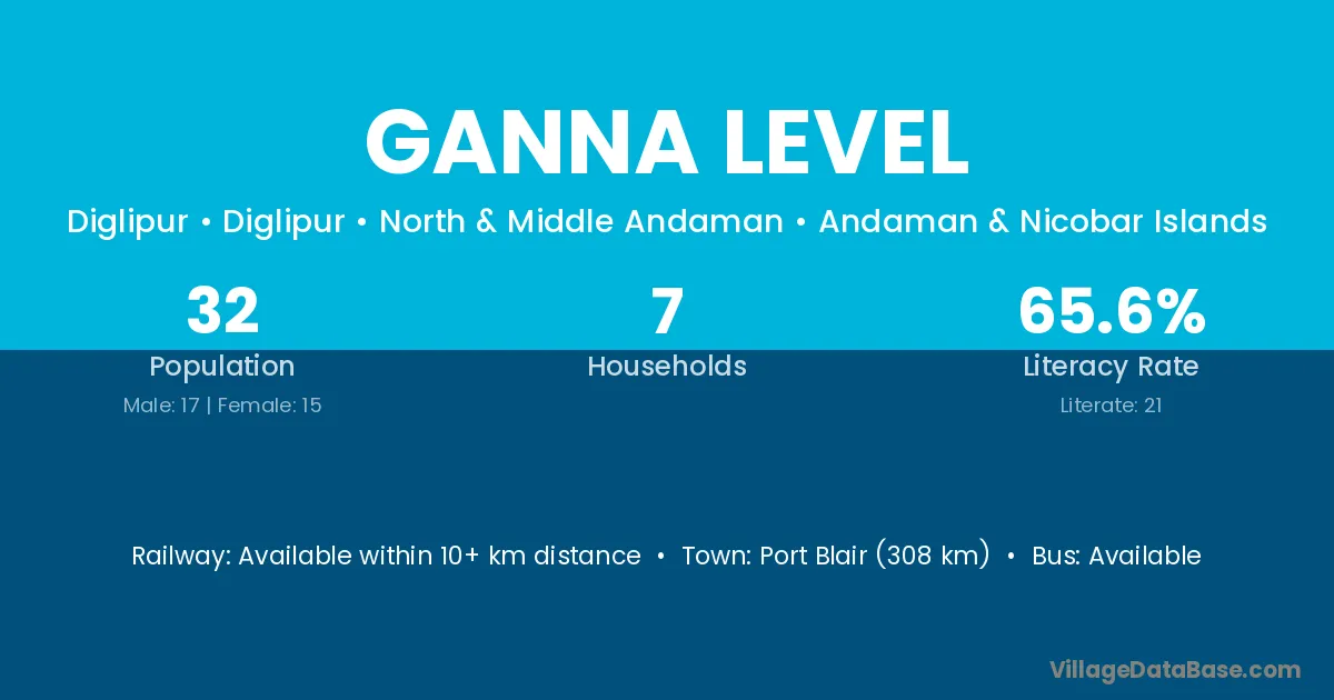 Port Blair (308 km) is the nearest town to Ganna Level village for major economic activities and is located approximately 308 km away.