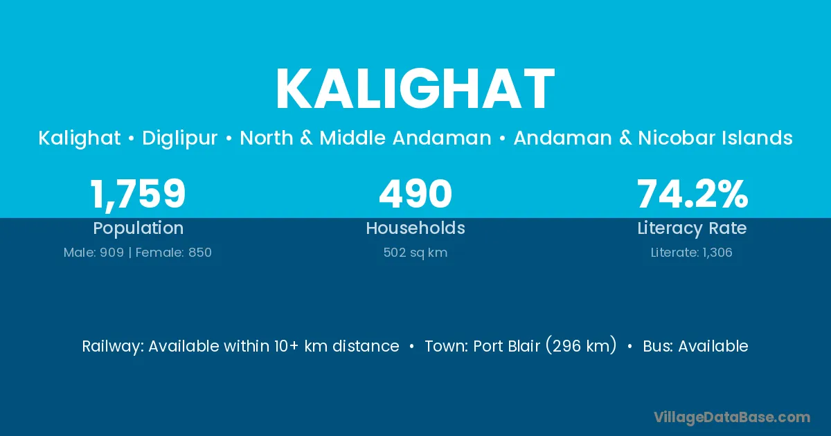 Port Blair (296 km) is the nearest town to Kalighat village for major economic activities and is located approximately 296 km away.