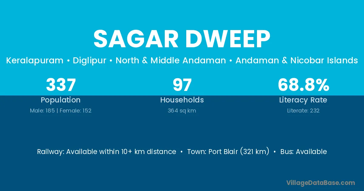 Port Blair (321 km) is the nearest town to Sagar Dweep village for major economic activities and is located approximately 321 km away.