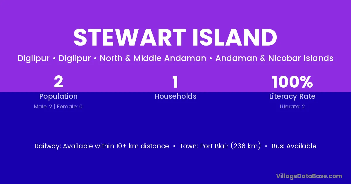 Port Blair (236 km) is the nearest town to Stewart Island village for major economic activities and is located approximately 236 km away.