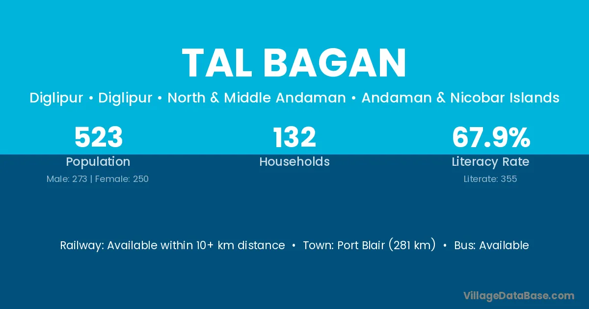 Port Blair (281 km) is the nearest town to Tal Bagan village for major economic activities and is located approximately 281 km away.