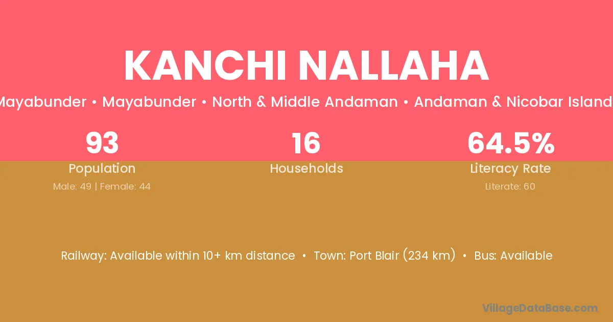 Port Blair (234 km) is the nearest town to Kanchi Nallaha village for major economic activities and is located approximately 234 km away.
